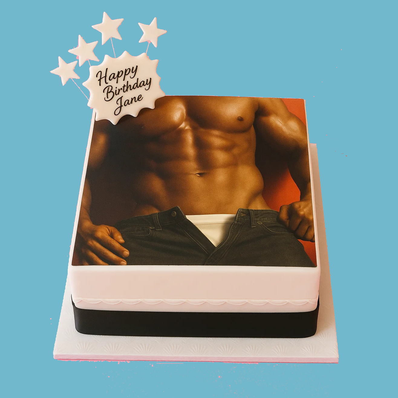 The Fit Fella Cake offers a unique way to celebrate with a truly personalised centrepiece. First, you can feature a favourite photo, design, or special message directly printed onto smooth fondant icing. This cake showcases your chosen image with vibrant colors and sharp detail, creating a striking visual effect that naturally draws attention. Moreover, the clean, fondant-covered surface provides an elegant backdrop, allowing your image to stand out beautifully. To complete the design, we finish the cake with a personalised message plaque and decorative star toppers, which add an extra special touch.