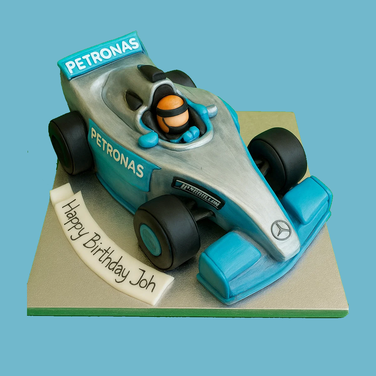 The cake prominently features the Petronas branding in teal and silver, accurately reflecting the colours and style of a professional Formula One car. This branding adds authenticity and makes the cake especially popular with fans of the sport and the team. The cake’s black tyres are crafted from fondant, adding to the realistic appearance. A small driver figure sits in the cockpit, bringing life and character to the design.