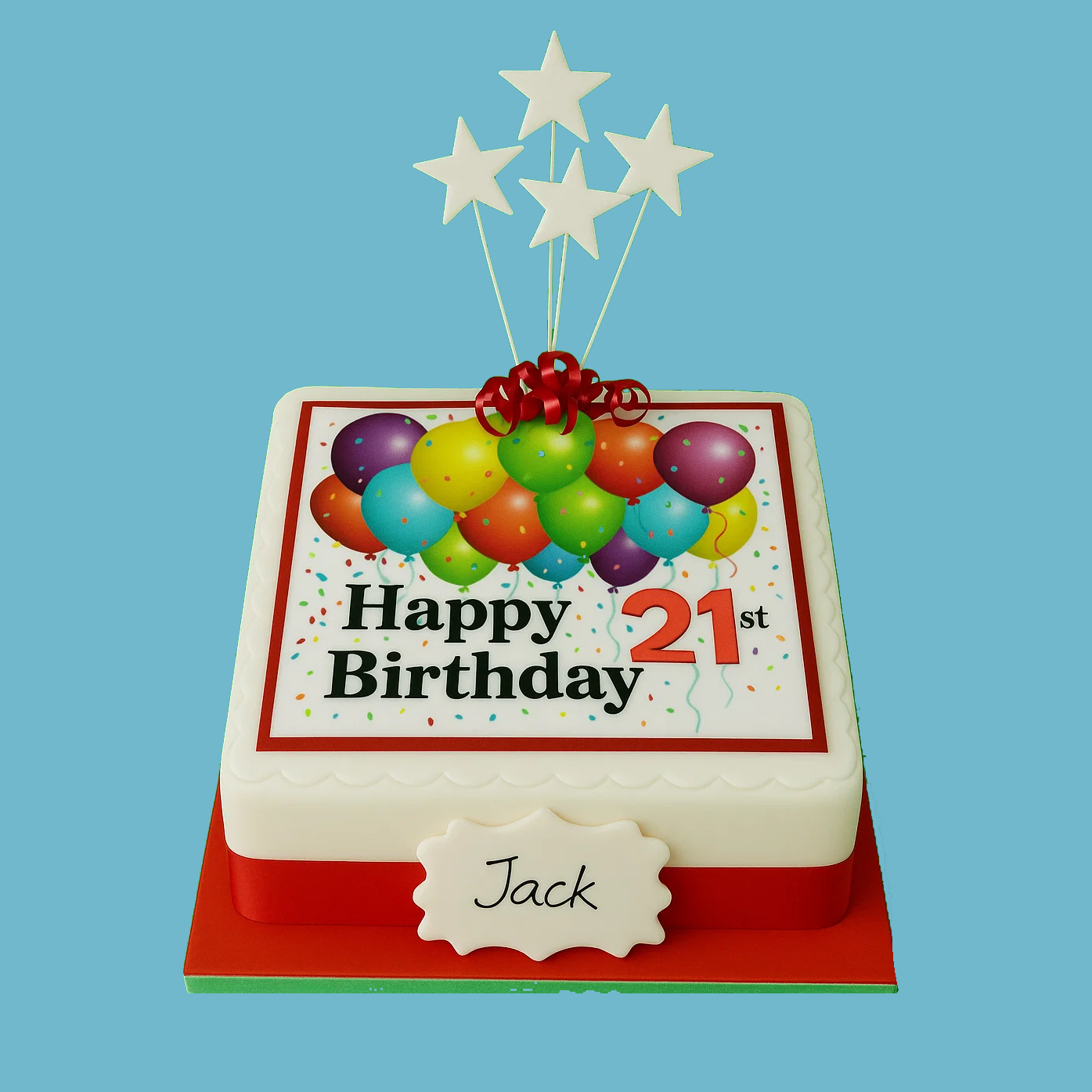 Bring a burst of joy and vibrant colour to your celebration with the Multicoloured Balloon Cake. This square cake boasts a lively design featuring a delightful cluster of balloons in an array of eye-catching colours. You will find purple, blue, green, yellow, orange, and red balloons creating a cheerful and festive atmosphere. The cake’s surface is further adorned with charming star accents that add sparkle and enhance its playful theme. A bold red border surrounds the cake, offering a striking contrast that perfectly frames the colourful design.