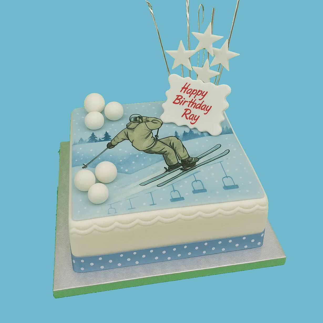 Celebrate any occasion with the exciting and vibrant Skiing Cake, perfect for fans of winter sports and snowy adventures. This square cake features a detailed skiing scene that brings a lively atmosphere to your celebration. A skilful figure skis down a snowy slope, capturing the thrill and movement of the sport. This dynamic design makes the cake an eye-catching and thematic centrepiece for birthdays, winter parties, or sports events.
