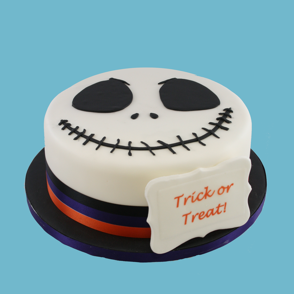 A fun and striking cake featuring the face of the much-loved Pumpkin King, Jack Skellington, with his iconic stitched smile.